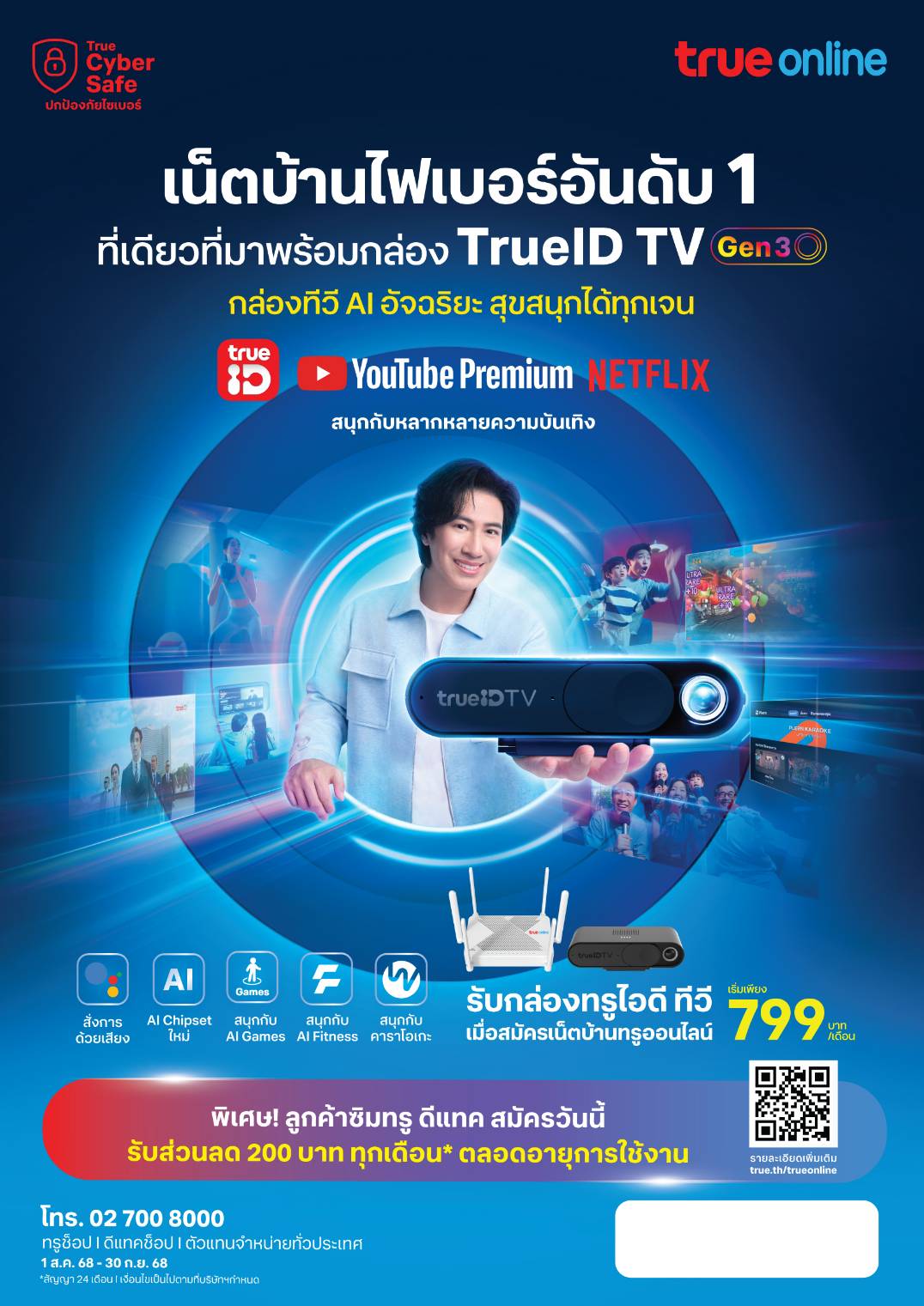 แพ็กเกจใหม่มาพร้อมก ทรูกิกะเทค ไฟเบอร์ล่อง โปร เราเตอร์ (WiFi 6) รวมคลื่น WiFi ทุกความถี่เป็นชื่อเดียว เลือกสัญญาณที่ดีที่สุดให้อัตโนมัติครอบคลุมพื้นที่การใช้งานมากกว่าเดิม เล่นเน็ตแรงต่อเนื่อง